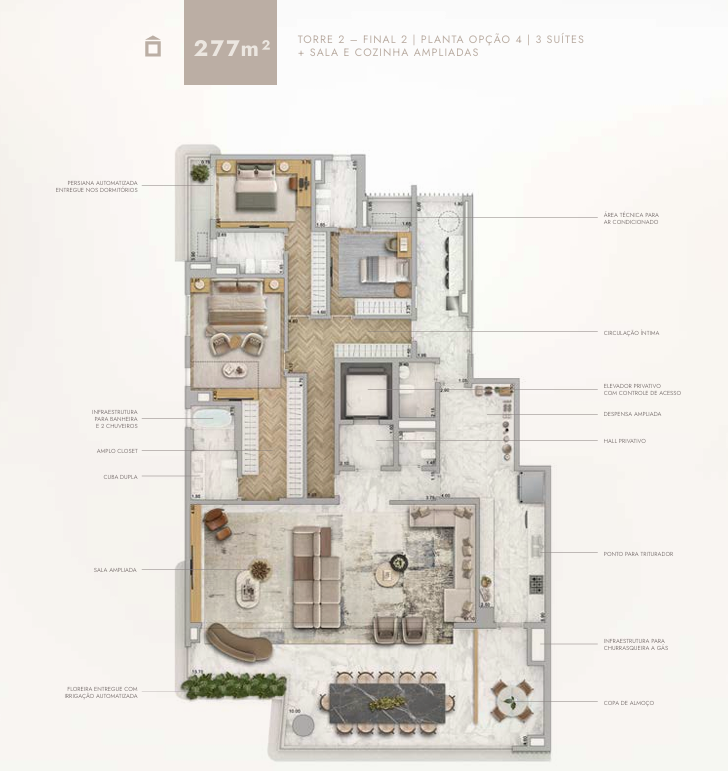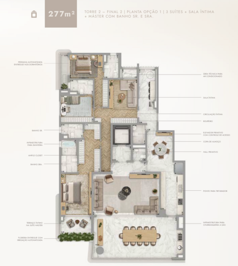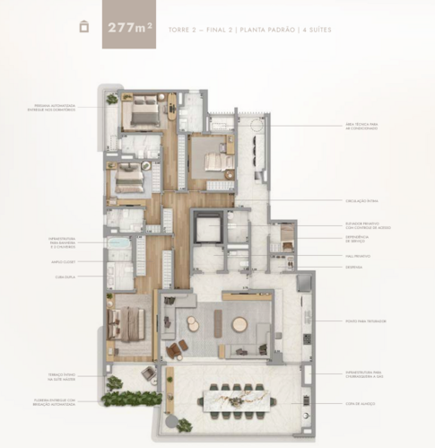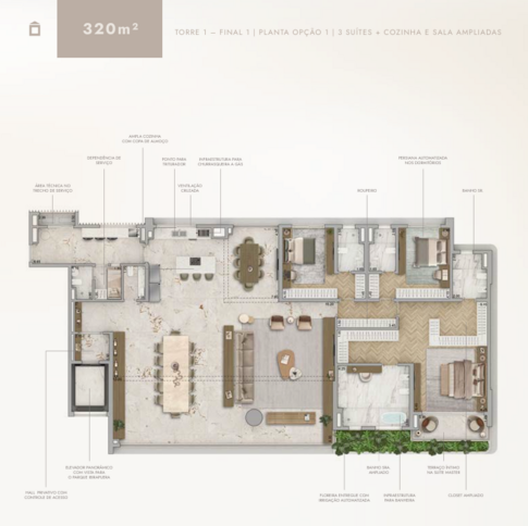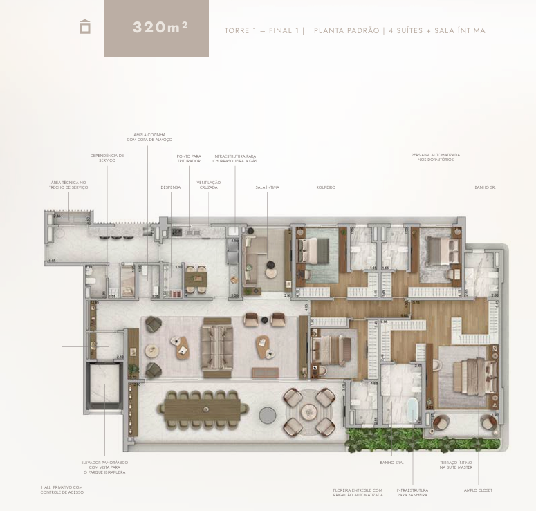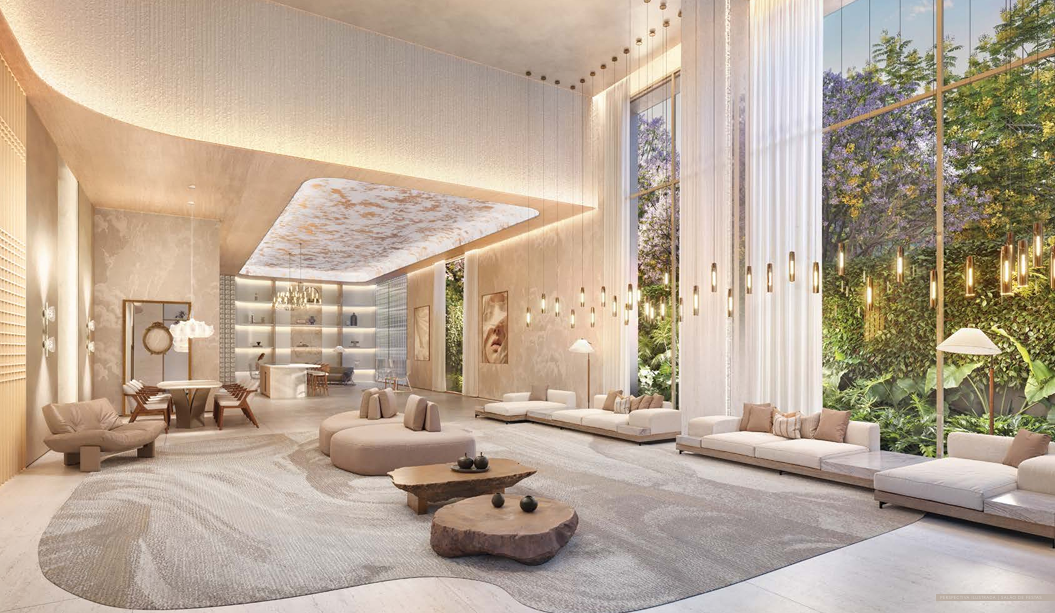 O projeto é composto por duas torres residenciais e oferece apartamentos de 277m² e 320m², com opções de três ou quatro suítes, sala íntima e amplas varandas. Todas as unidades contam com hall privativo, elevador com controle de acesso, persianas automatizadas, floreiras com irrigação automática, infraestrutura para banheira e churrasqueira a gás, além de ventilação cruzada e vistas privilegiadas para o Parque Ibirapuera.